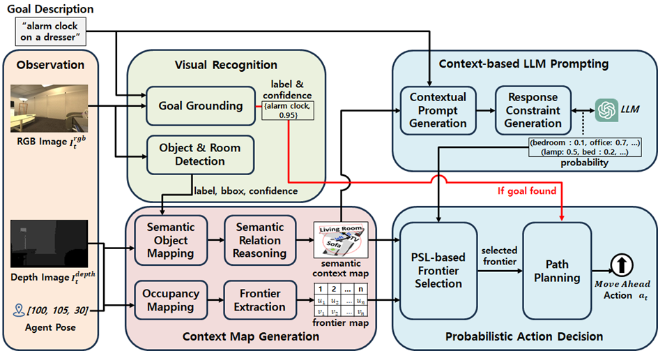 · LLM에 환경 맥락을 제공해 목표 방 추론 후 연관 물체 추론으로 이어지는 2단계 reasoning